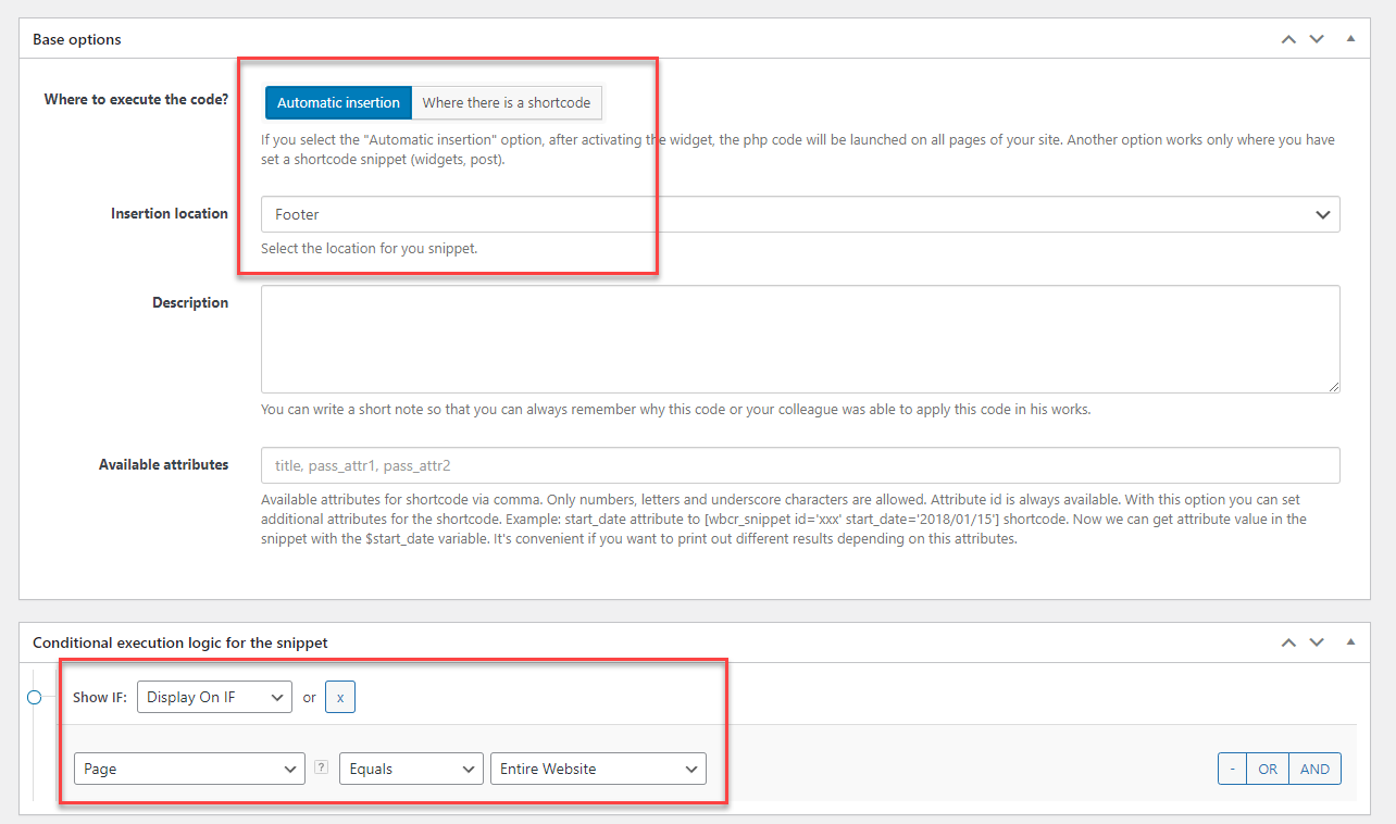 As per the above screenshot, the code has to be inserted automatically – Automatic insertion, the location would be Footer and show on Entire Website.